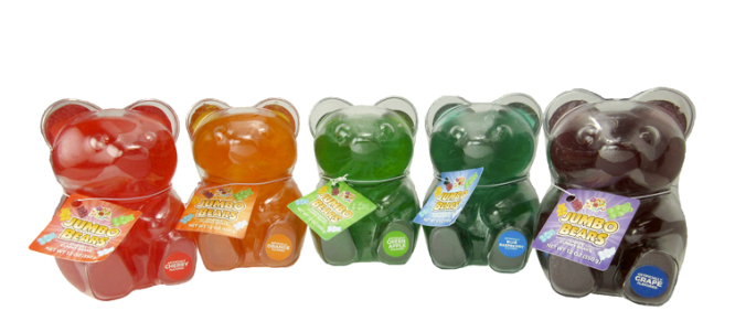 Jumbo gummy bear is 4 inches tall and gummy bears are packaged in a hard, clear, reusable case that keeps them clean and fresh.